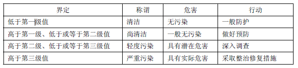 注:⑴ 国家环境保护总局:《全国土壤污染状况调查样品分析测试技术规定》,2006a,①日本环境省:《底质调查方法》,②中国监测总站:《土壤元素的近代分析方法》,③USEPA推荐MRID#:420453-01,④ USEPA推荐MRID#:443265-07,⑤USEPA推荐MRID#:422005-01,⑥USEPA推荐MRID#:406144-14,⑦USEPA推荐MRID#:414327-06,⑧USEPA推荐MRID#:447123-01; ⑵ 鲁如坤:《土壤农业化学分析方法》。 9 应用 在进行土壤环境质量评价时,将土壤污染物监测浓度与第一、二级标准值相对照,若低于或等于第一级标准值,则可称谓“清洁”(表6)。若高于第一级、低于或等于第二级标准值,则表明一般无污染危害,可称谓“尚清洁”,但说明已有污染物进入,应予以警惕,及时找出和控制土壤污染源,防止污染物继续进入土壤,切实保护好土壤环境质量。 若土壤污染物监测浓度高于第二级标准值,则表明具有潜在危害,有可能发生污染危害,可称谓轻度污染,应给予充分的关注,同时报告所在地人民政府环境保护行政主管部门,并继续进行深入详查,或委托具有土壤污染风险评估资质的机构开展场地土壤污染风险评估,对相关受体进行调查采样分析。 若有污染危害,应提出建议该场地第三级标准值与其依据以及管理对策报告书,提交环境保护行政主管部门批准后在该场地实施。 若土壤污染物监测浓度超过第三级标准值,可称谓严重污染(具有实际危害),应纳入土壤污染整治计划并实施。场地整治包括:用地方式改变,农业用地种植作物调整以及各种修复措施等。 在未建立土壤风险评估制度之前,可暂缓实施第三级标准。如土壤污染物监测浓度超过第二级标准值,则称谓超二级土标,可进行深入详查,若有污染危害则进行整治。 表6 土壤环境质量评价级别划分