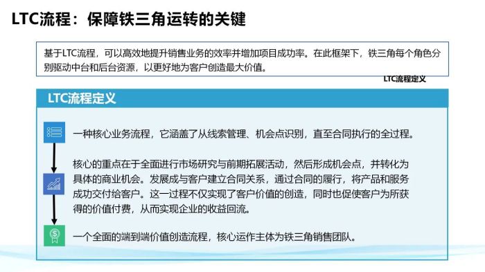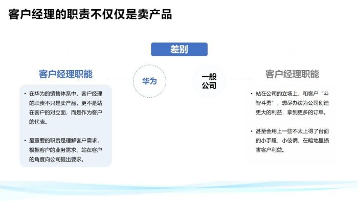 华为的“铁三角”工作法是其在销售和服务领域的一项重要创新,旨在通过客户经理(Account Responsibility, AR)、方案经理(Solution Responsibility, SR)和交付经理(Fulfillment Responsibility, FR)三者的紧密协作,实现对客户需求的全面覆盖和快速响应。以下是华为铁三角工作法的详细解密:客户导向:铁三角的核心是以客户为中心,通过团队协作,提供全面的客户解决方案。快速响应:铁三角成员能够快速响应客户需求,提供定制化的解决方案和服务。团队协作:铁三角成员之间通过分工合作,形成高效的团队,共同负责项目的成功。职责:负责客户关系管理、业务需求管理、销售项目的主导、全流程交易质量的责任、客户群规划的制定和执行。职责:负责产品需求管理、解决方案设计、报价与投标、技术问题解决。职责:负责项目实施交付、质量控制、客户满意度提升。全面覆盖:铁三角成员各自负责不同的方面,确保客户需求的全面覆盖。快速响应:通过团队协作,能够快速响应客户需求,提供及时的服务和支持。专业分工:每个角色都有自己的专业能力,能够覆盖客户的各个方面的需求。协同作战:通过团队协作,形成一个完整的闭环,从销售到交付,确保项目的成功。决策权下放:铁三角成员具有一定的决策权,能够根据客户的变化和市场的变化,快速做出调整和应对。高效执行:通过明确的职责划分和高效的协作机制,提高项目的执行效率和质量。共同目标:铁三角成员有共同的目标和利益,能够形成一个紧密的团队。相互支持:成员之间相互支持,相互配合,相互学习,提高项目的成功率。选择合适成员:根据客户的规模、重要性和复杂度,选择合适的客户经理、方案经理和交付经理。明确职责和目标:明确每个角色的职责和目标,建立有效的沟通和协作机制。客户分析:分析客户的战略、需求和痛点,找到机会点。制定计划:制定客户群的目标和策略,分析客户的决策链,制定销售计划、方案计划和交付计划。项目管理:按照计划进行项目的执行,包括销售项目的管理、客户关系的维护、产品和方案的设计、报价和投标、合同的签订、项目的交付、质量的控制、客户的满意度提升。监控和调整:监控项目的进展情况,及时调整计划和策略,确保项目的顺利进行。评估效果:根据项目的执行结果,评估目标和策略的效果。改进方案:对方案和产品进行改进,提高项目的质量和效率。总结经验:总结项目的成功经验和教训,为后续项目提供参考。事权授权:赋予铁三角成员一定的决策权,确保他们能够快速响应客户需求。财权授权:给予铁三角成员一定的预算管理权,确保项目的顺利进行。人权授权:赋予铁三角成员一定的团队管理权,确保团队的高效运作。绩效考核:建立科学的绩效考核体系,确保每个角色的职责和绩效挂钩。奖励机制:设立合理的奖励机制,激励团队成员的积极性和创造力。职业发展:提供职业发展路径,帮助团队成员提升能力和职位。 华为铁三角工作法通过客户经理、方案经理和交付经理的紧密协作,实现了对客户需求的全面覆盖和快速响应。这种方法不仅提升了客户满意度,还提高了项目的成功率和团队的效率。希望这个解密能够帮助你更好地理解和应用华为铁三角工作法。如果有任何具体的问题或需要进一步的细化,请随时告诉我!